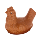 Poule de 275g, garnie de fritures en chocolat (lait, noir, dulcey), posée sur un socle en chocolat.